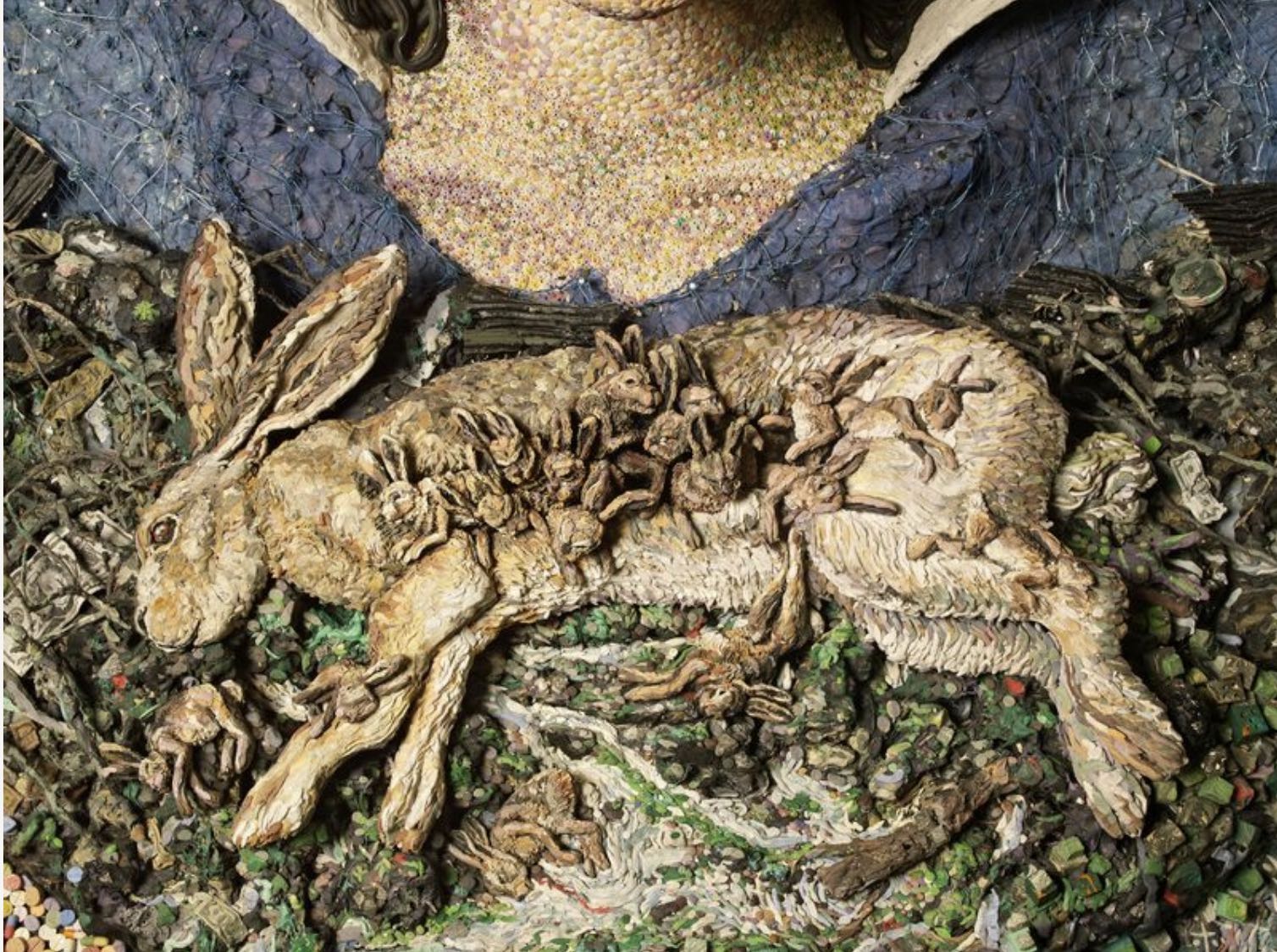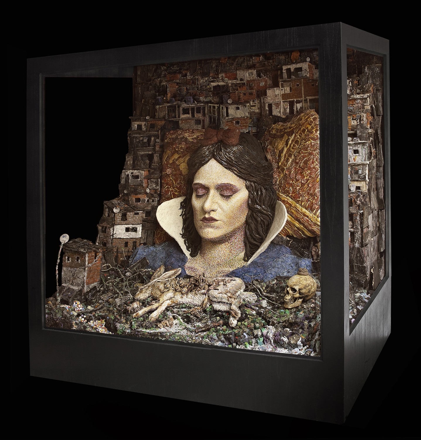 El colectivo artístico contemporáneo Mondongo satiriza esta construcción dicotómica que contrasta la pureza y la sanidad de Disney con la pobreza latinoamericana. La obra “Me conformaría con poder dormir” presenta a Blancanieves, la más pura del reino, inmersa en un lodo hecho de basura y del tipo de ladrillos y metal corrugado de las villas miseria argentinas. La minucia y el detalle invitan a una mirada más de cerca que revela un subnivel aún más sórdido. Una pequeña calavera ostenta una hebra de caca en la frente; un grupo de pastillas farmacológicas forman las desgranadas cuentas de una diadema rota. La obra hace alusión directa a la emblemática escena del film de Disney en la que los enanos sobrecogidos por la congoja velan a Blanca Nieves. Pero en lugar de estar dentro de un cofre de oro y cristal, Mondongo la ha puesto vertical en una vitrina como la de Zoltar, el siniestro adivino autómata que por unas monedas te adivina la suerte en los parques de diversiones de baja estofa de Estados Unidos. Aquella Blancanieves es remota, trascendente y rozagante; ésta muestra la tensión del asco incipiente en el mohín del labio superior y en un vire hacia el morado que crispa su rostro: sus ojos cerrados no descansan, rechazan; su peinado compacto como un casquito es aquí un nido de hebras grasientas; su cabeza descansa sobre una almohada hecha no ya de flores sino de chorizos, morcillas y otros abyectos embutidos; en lugar de un ramo de flores, Blancanieves tiene sobre su pecho una coneja madre muerta, de cuyo vientre caen como excreciones varios fetos tumefactos.