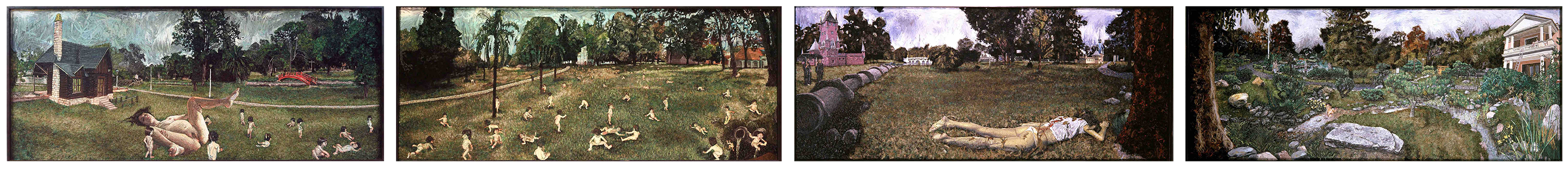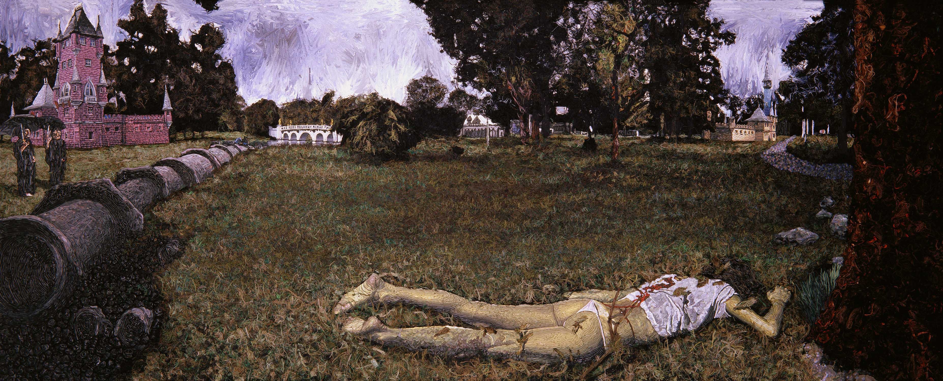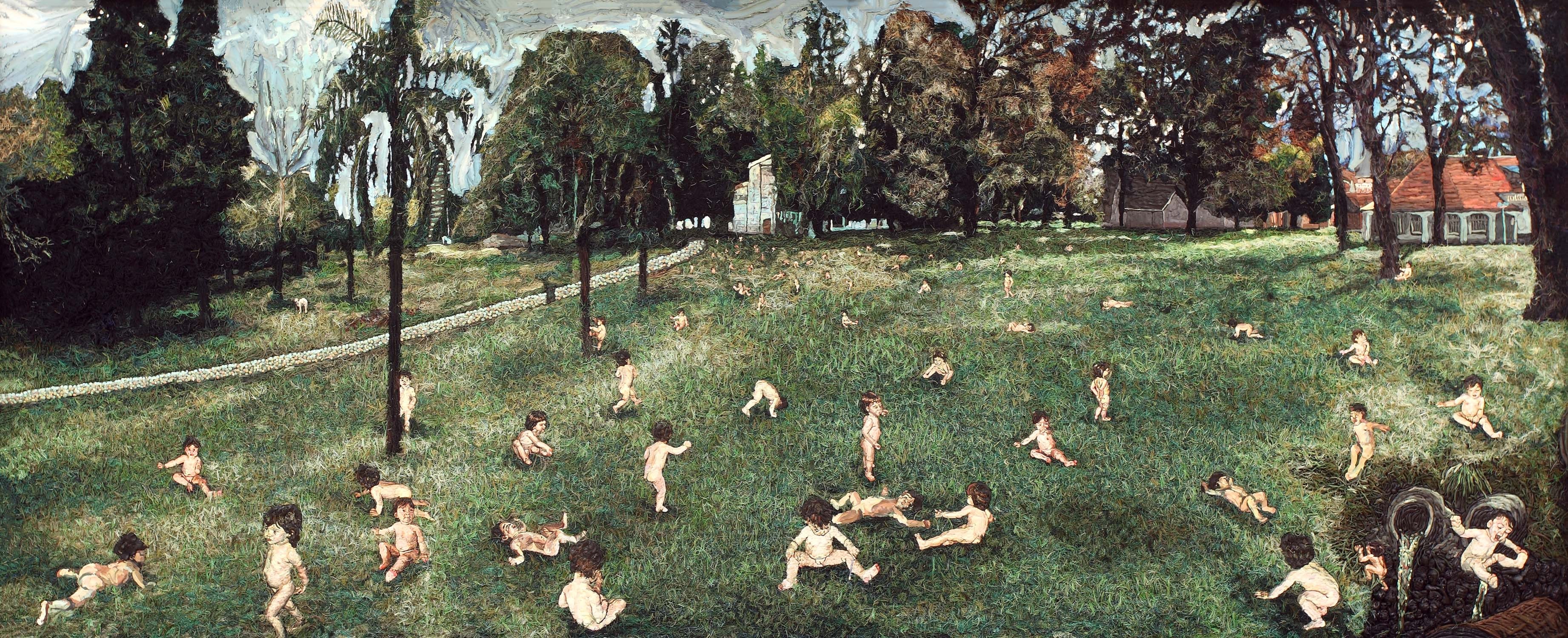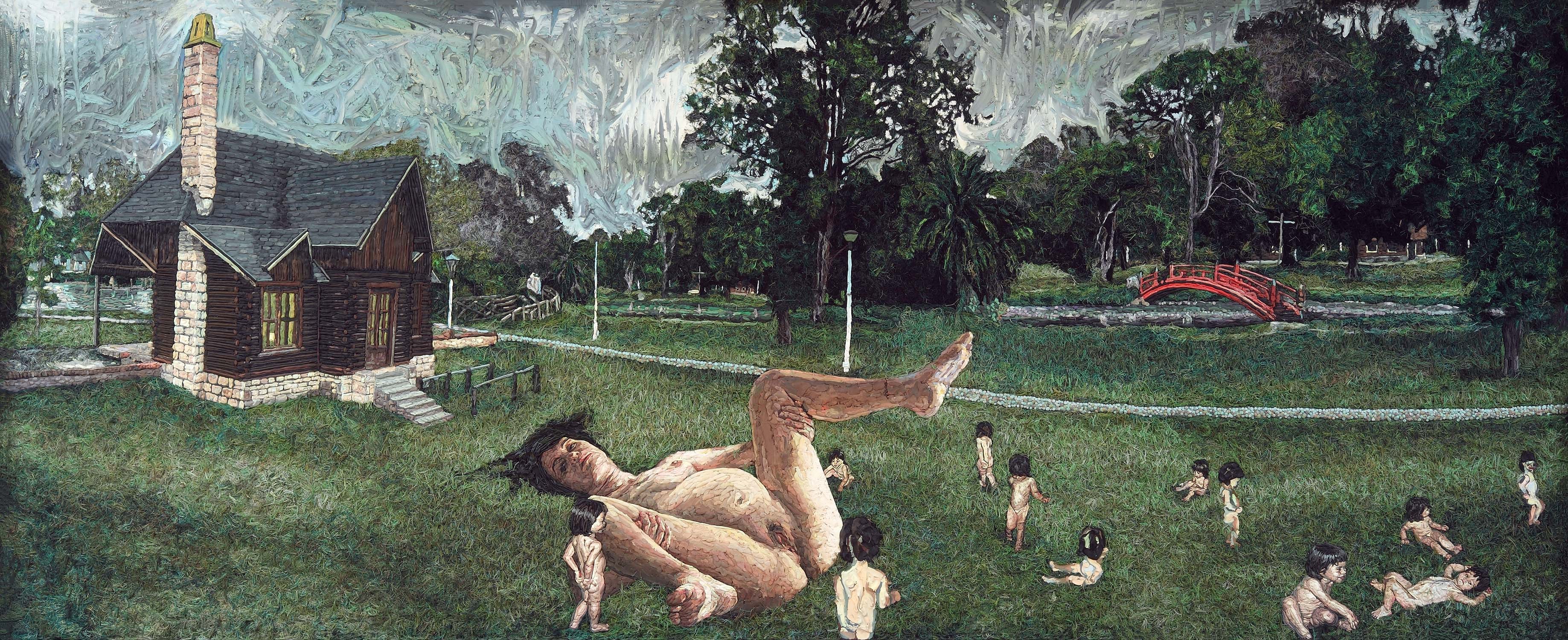 La primera de las imágenes de esta serie presenta la desolación, como una película de terror en blanco y negro. El estar hecha en cera aumenta el sentido de la opacidad y le da una textura cadavérica. Los materiales aumentan la violencia y hacen foco en la forma abandonada y grotesca de la víctima, y de su estado de desnudez abusada. Se trata de un tiempo en el que la muerte violenta y los abusos de poder eran corrientes. Si bien es cierto que La República de los Niños, como locación oscura y amenazante, puede servir como metáfora para todo el resto de repúblicas bananeras de cualquier parte del mundo, dentro del contexto argentino la imagen adquiere connotaciones múltiples que amplían su campo de referencia más allá del cuerpo abandonado y del acopio de sombras que dan a la obra la densidad horrorosa de lo particular. La imagen que la acompaña es más suave, trabajada en lana y plastilina, y en ella la víctima está más situada en los vericuetos de la memoria y la imaginación, es más una parte del paisaje que un símbolo descarnado.