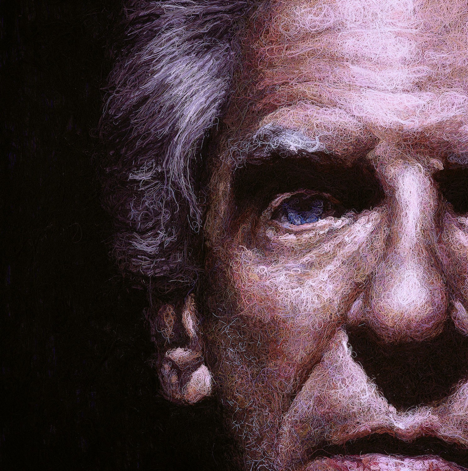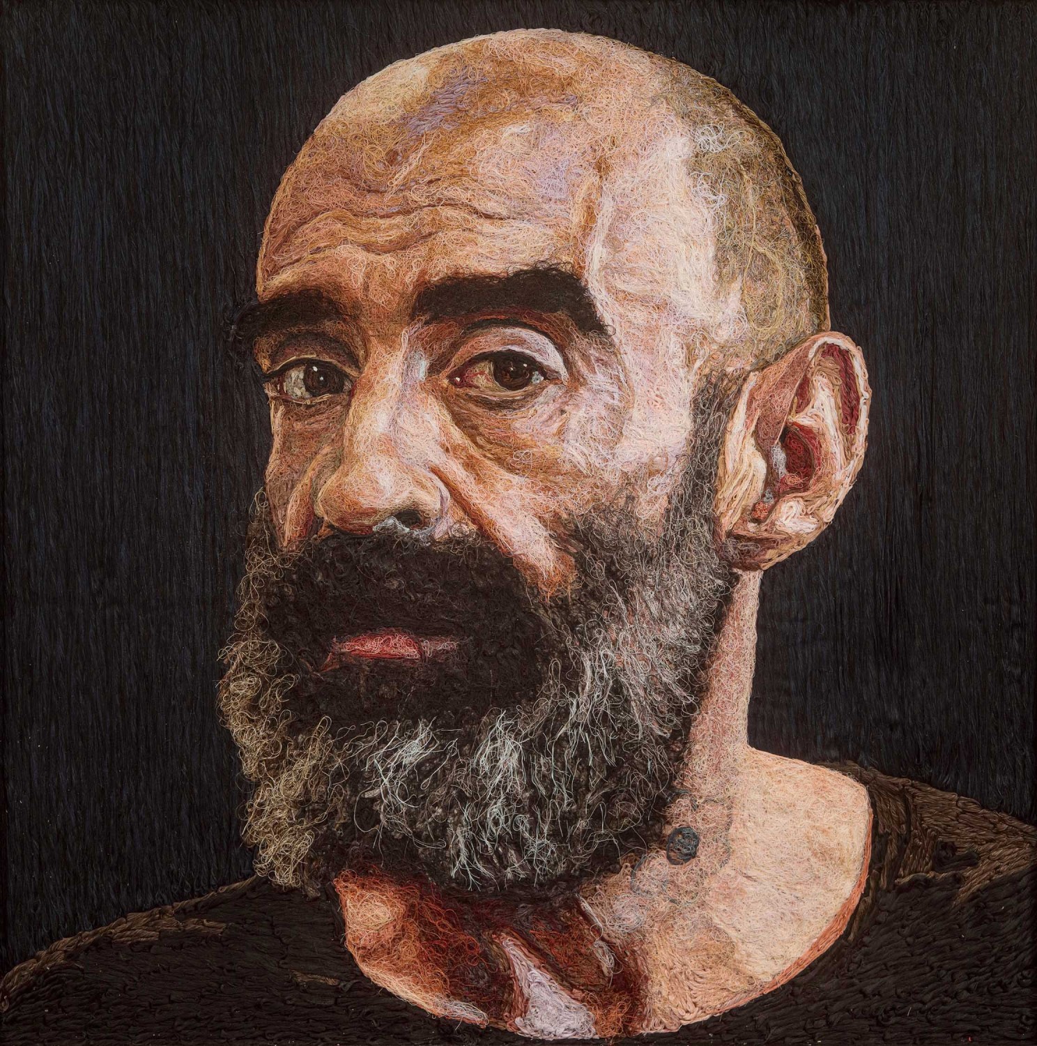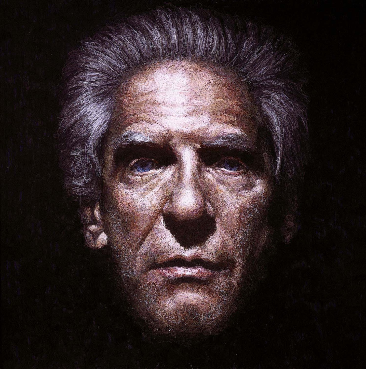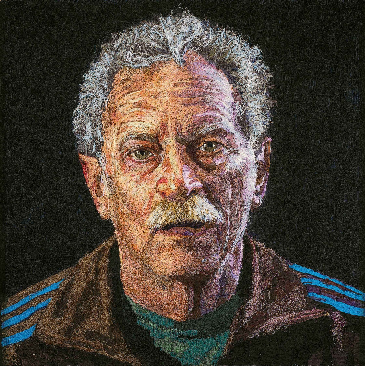 La técnica de hilos surgió con el retrato de Kevin Power, y lo emplearon en el de Fogwill y luego en el de Tom Patchett. Estos tres retratos, bajo mi punto de vista, podrían con- figurar una suerte de trilogía estructural, en el sentido de trío-sostén. Son retratos que, como en el caso de Fogwill, dan más de la persona que la imagen de su rostro. La sensación de unidad que consiguen en el retrato de Fogwill, por ejemplo, abre de inmediato las posibilidades de lectura hacia otras dimensiones de la personalidad de carácter psicológico: inconformista, complejo, lúcido, imaginativo, radical, atractivo... El tratamiento de los detalles en los cabellos, los ojos, la boca o las arrugas de la cara, los juegos de luces y los fondos neutros y profundos destacan, aún más, la presencia de esas tres cabezas iluminadas.