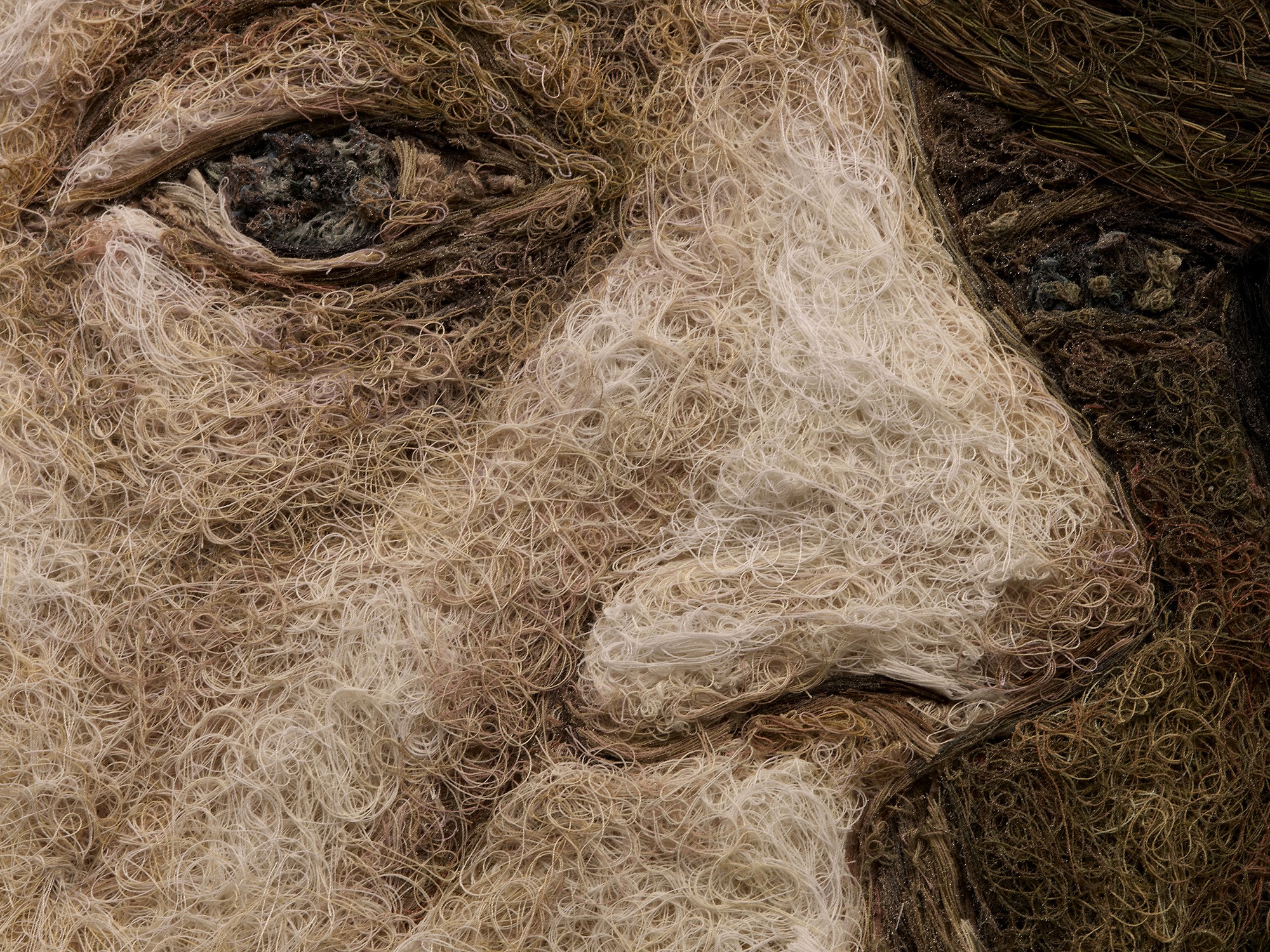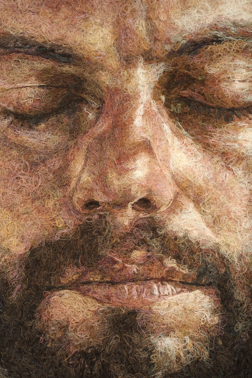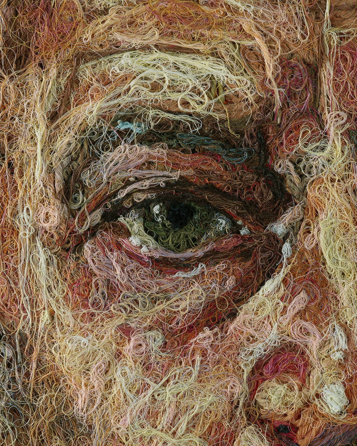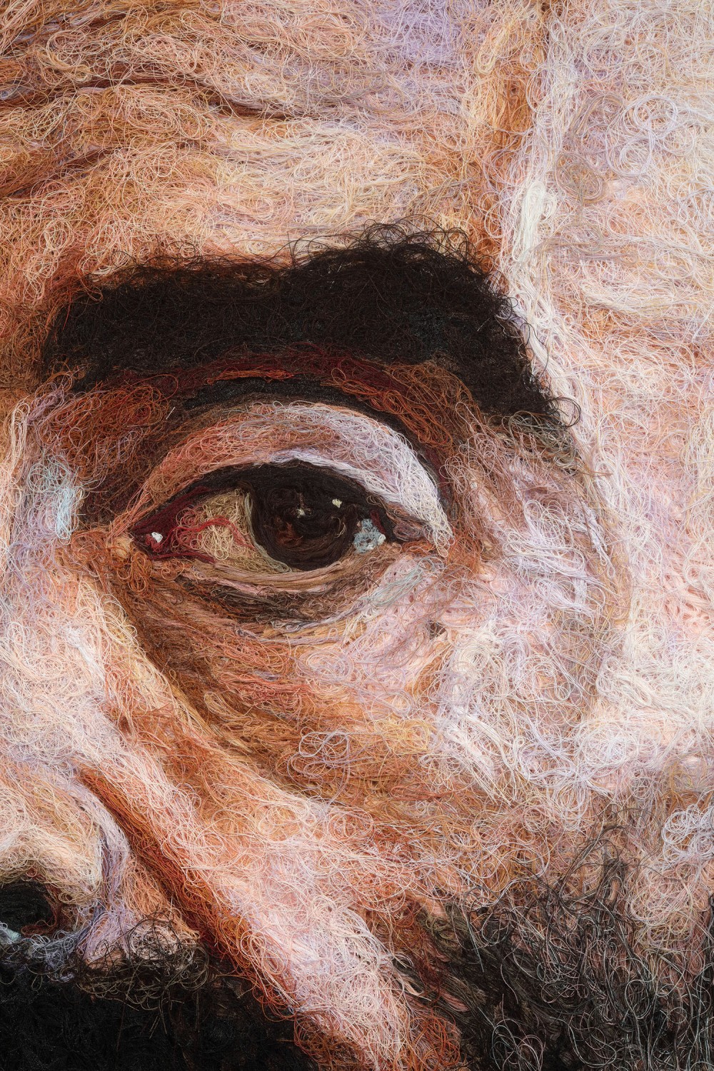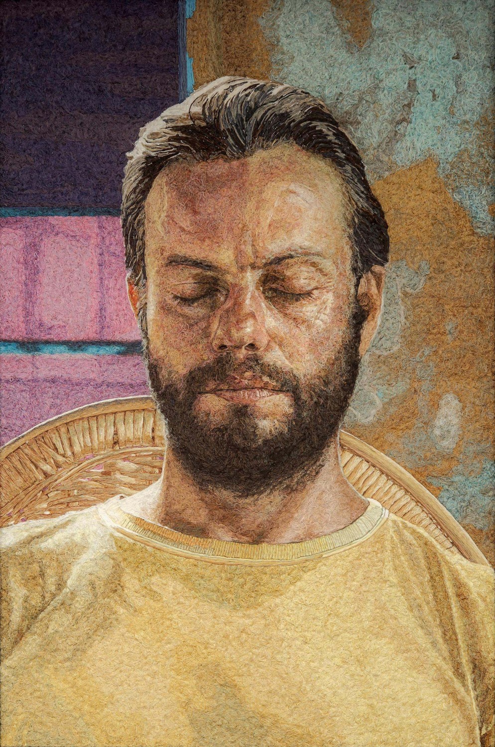 La técnica de hilos surgió con el retrato de Kevin Power, y lo emplearon en el de Fogwill y luego en el de Tom Patchett. Estos tres retratos, bajo mi punto de vista, podrían con- figurar una suerte de trilogía estructural, en el sentido de trío-sostén. Son retratos que, como en el caso de Fogwill, dan más de la persona que la imagen de su rostro. La sensación de unidad que consiguen en el retrato de Fogwill, por ejemplo, abre de inmediato las posibilidades de lectura hacia otras dimensiones de la personalidad de carácter psicológico: inconformista, complejo, lúcido, imaginativo, radical, atractivo... El tratamiento de los detalles en los cabellos, los ojos, la boca o las arrugas de la cara, los juegos de luces y los fondos neutros y profundos destacan, aún más, la presencia de esas tres cabezas iluminadas.
