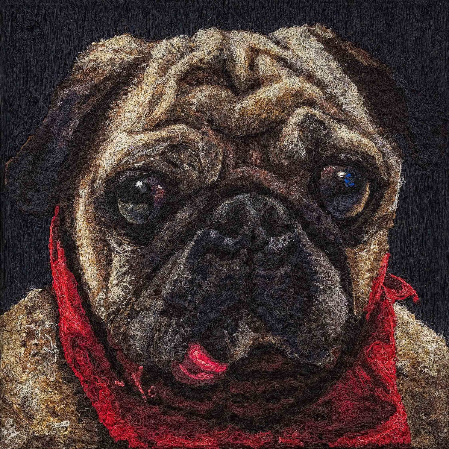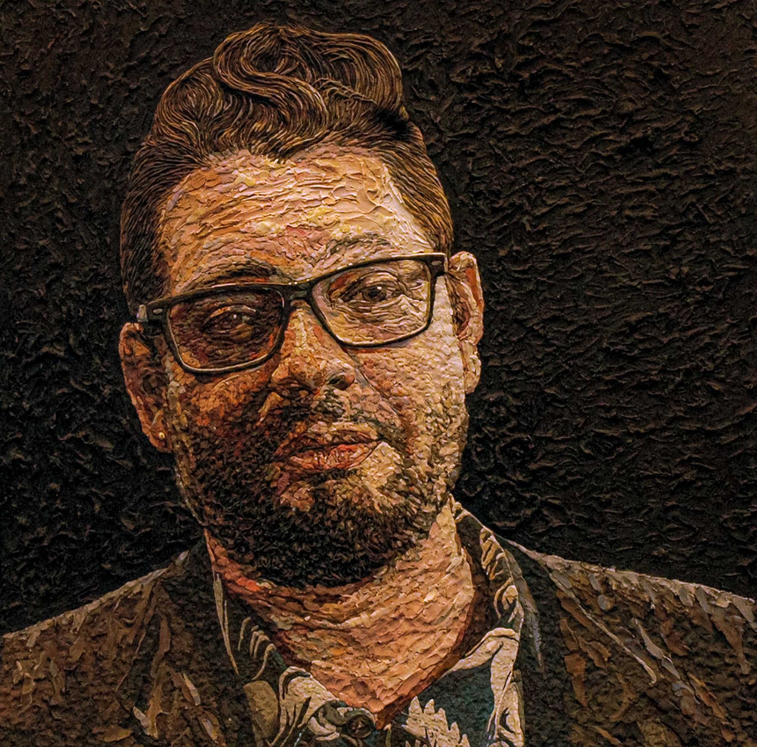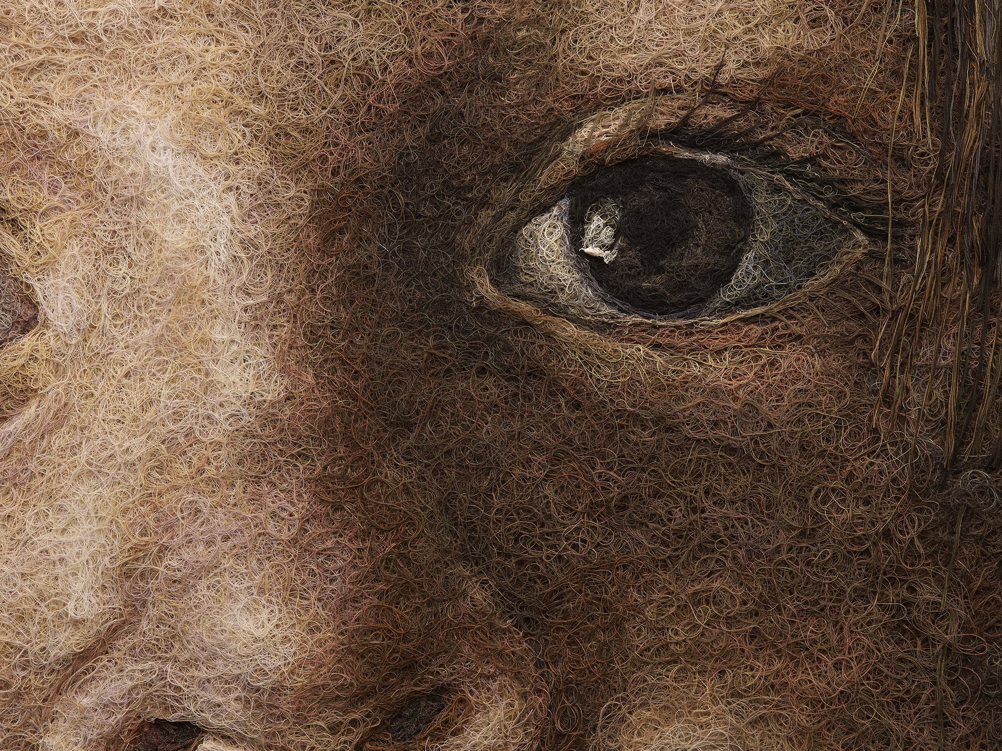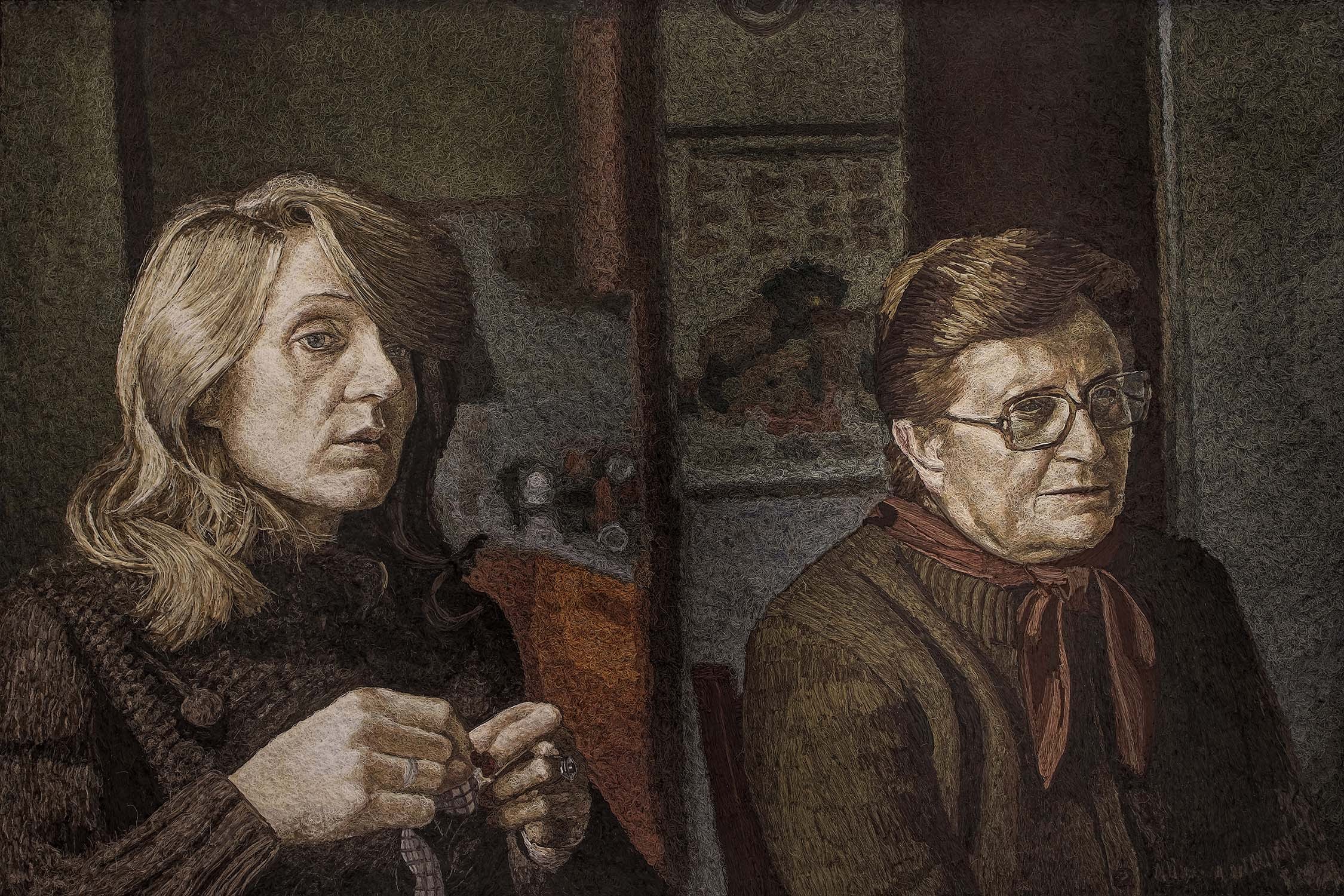 La técnica de hilos surgió con el retrato de Kevin Power, y lo emplearon en el de Fogwill y luego en el de Tom Patchett. Estos tres retratos, bajo mi punto de vista, podrían con- figurar una suerte de trilogía estructural, en el sentido de trío-sostén. Son retratos que, como en el caso de Fogwill, dan más de la persona que la imagen de su rostro. La sensación de unidad que consiguen en el retrato de Fogwill, por ejemplo, abre de inmediato las posibilidades de lectura hacia otras dimensiones de la personalidad de carácter psicológico: inconformista, complejo, lúcido, imaginativo, radical, atractivo... El tratamiento de los detalles en los cabellos, los ojos, la boca o las arrugas de la cara, los juegos de luces y los fondos neutros y profundos destacan, aún más, la presencia de esas tres cabezas iluminadas.